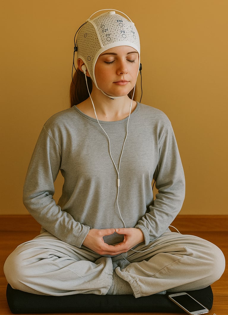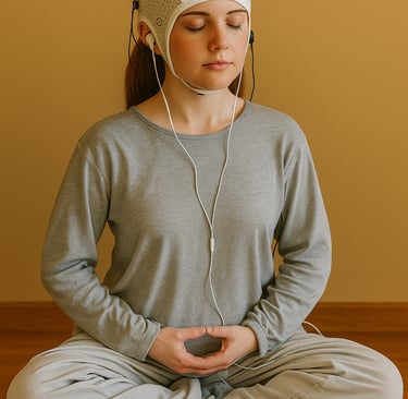 During a Neuromeditation session, you wear small EEG sensors that gently track your brain’s activity. As you settle into meditation, the system analyzes your brainwaves and provides instant feedback through sound or visuals.